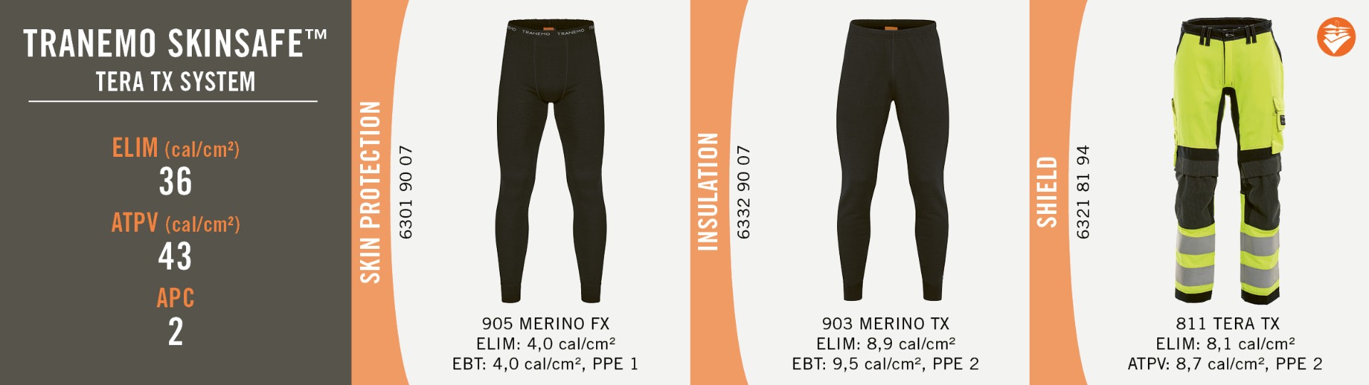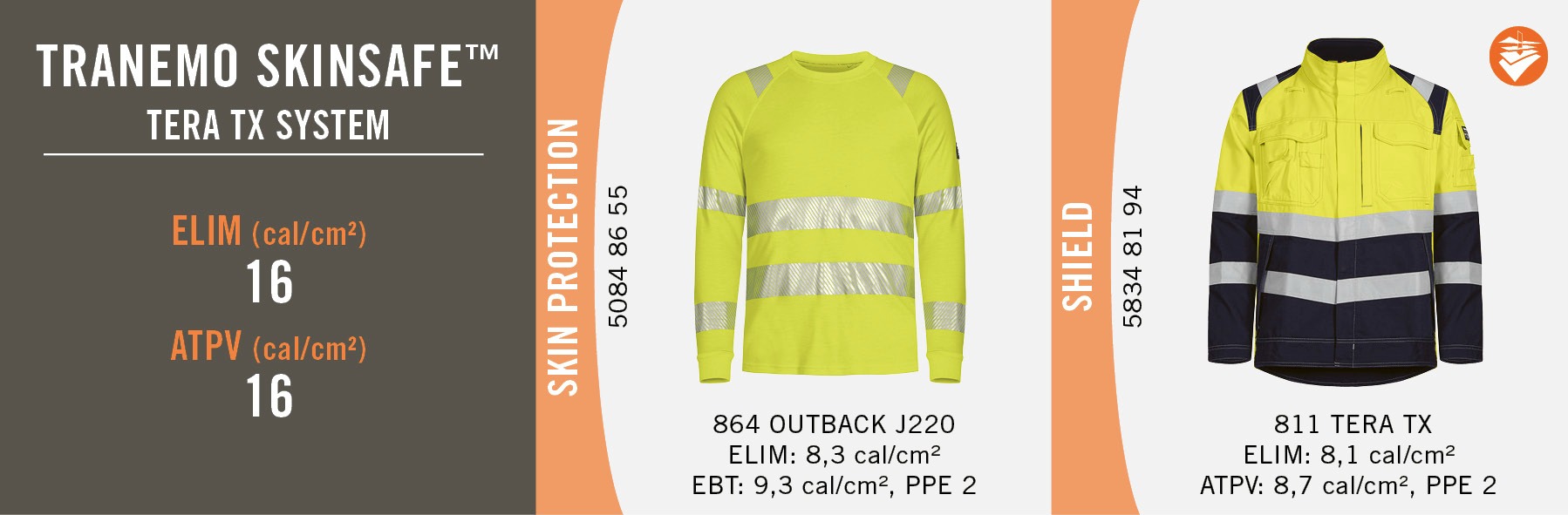 A Tranemo testa todas as novas peças de vestuário e vai voltar a testar o sistema Tranemo Skinsafe ™ de acordo com a norma EN 61482-2 revista que inclui os valores ELIM e ATPV / EBT.